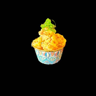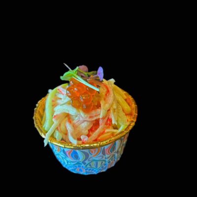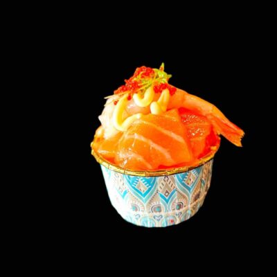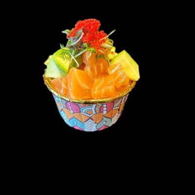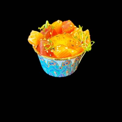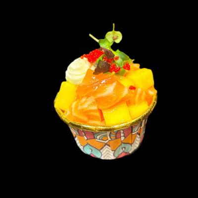 Knusprig frittierte Nori in Taco-Form gefüllt mit Reis, frischen Lachswürfeln,…