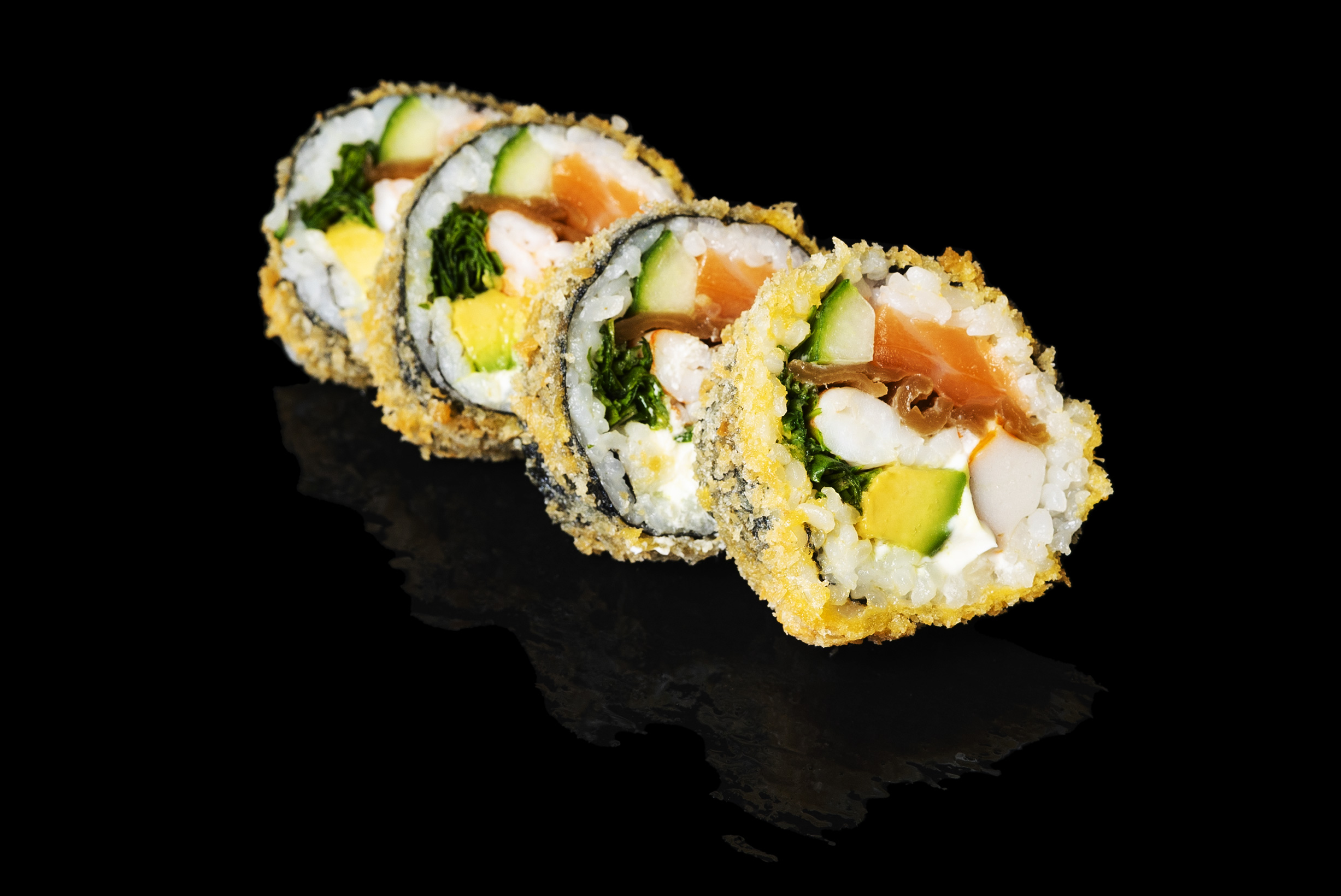 Frittierte große Rolle- Gefüllt mit Gurken, Avocado, eingelegter Kürbis, Lachs, Scampi, Frischkäse, Surimi 2,3,4,5,6,7